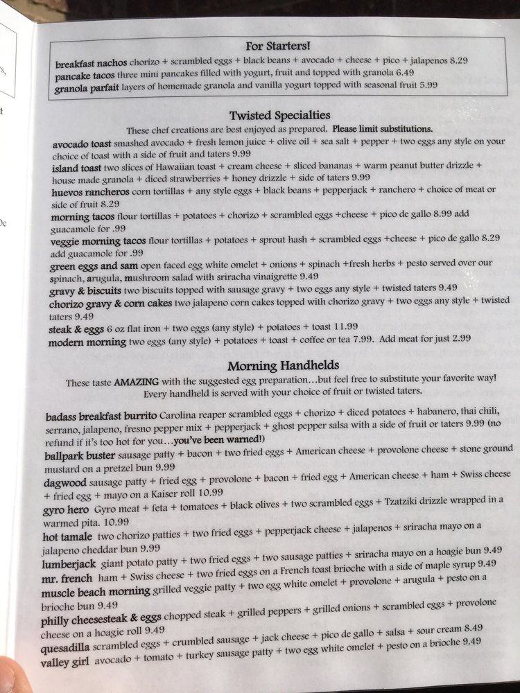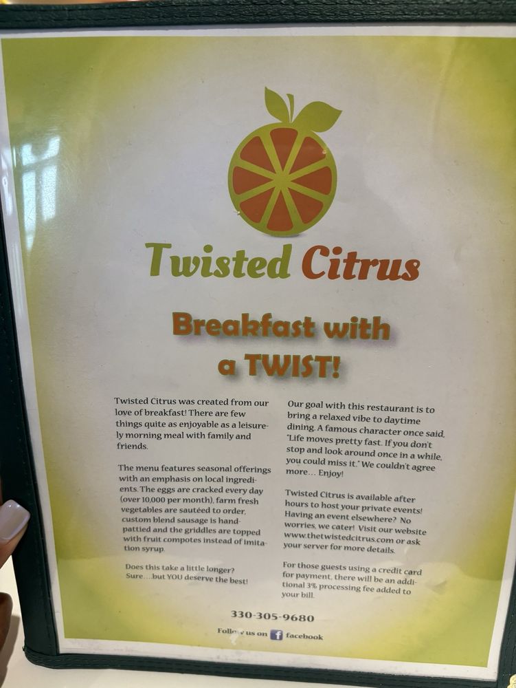Twisted Citrus, located in North Canton, OH, offers a creative breakfast and brunch experience with a festive and trendy ambiance. With a menu featuring a wide range of vegan and vegetarian options, as well as gluten-free choices, this restaurant caters to diverse dietary needs. Customers rave about the unique food combinations, such as scrambled eggs on a chicken Philly sandwich and yogurt-based banana split. The service is top-notch, with attentive waitstaff who are knowledgeable about the menu. The holiday decorations and cozy atmosphere add to the overall dining experience. Popular dishes include eggs Benedict with outstanding Hollandaise sauce and avocado toast. Twisted Citrus is a must-visit for those seeking a fun and delicious meal in a welcoming setting.